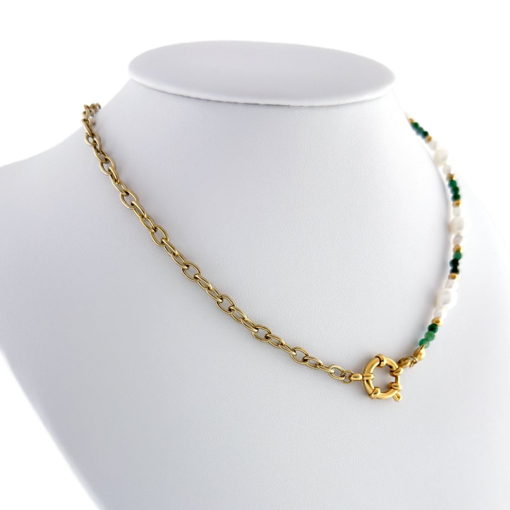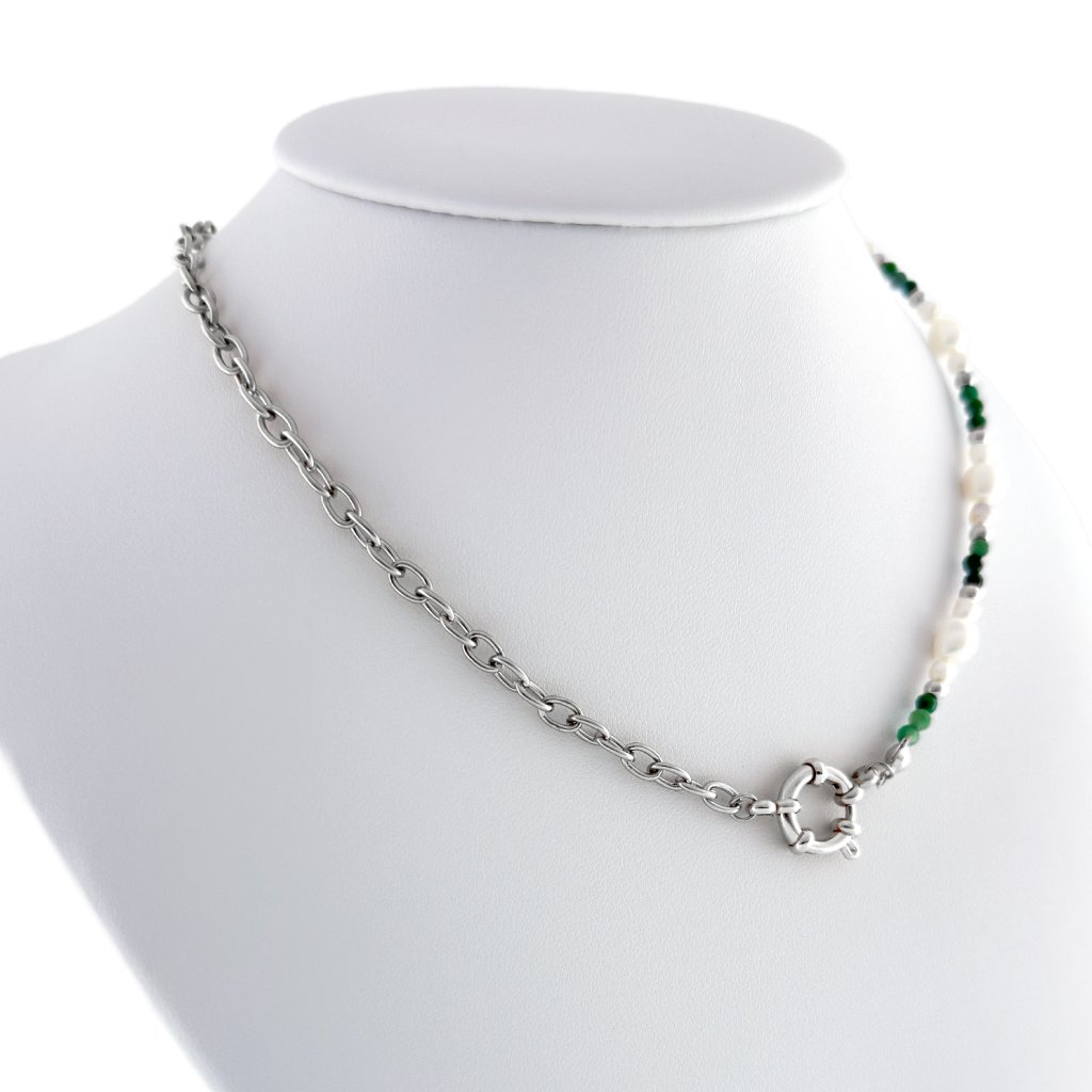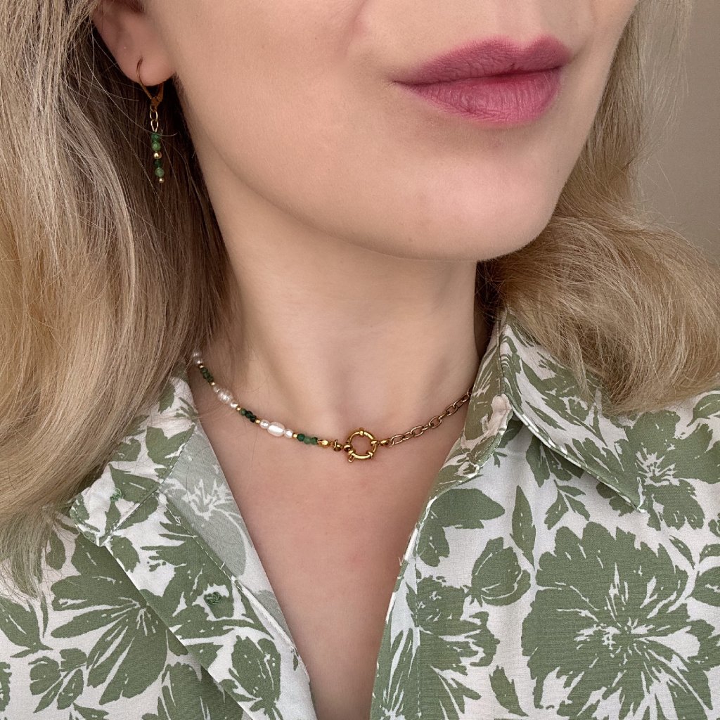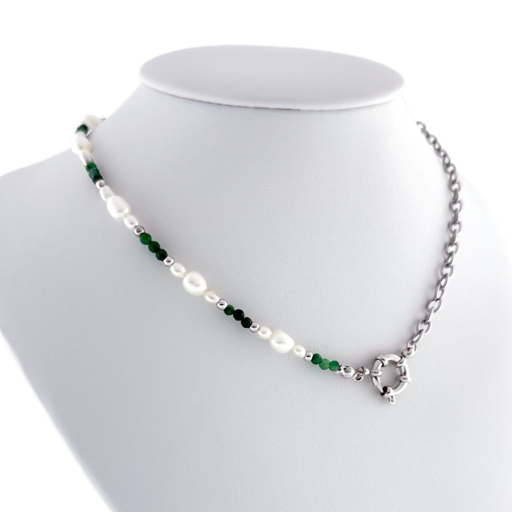 Ručně vyrobený náhrdelník se smaragdem a říčními perlami Carmen. Divoká krása přírody a její síla, kterou v sobě skrývá se odráží v tomto náhrdelníku. Jemné říční perly, jako kapky vody z klidného jezera, obklopují smaragd a dodávají náhrdelníku jemnost a harmonii.