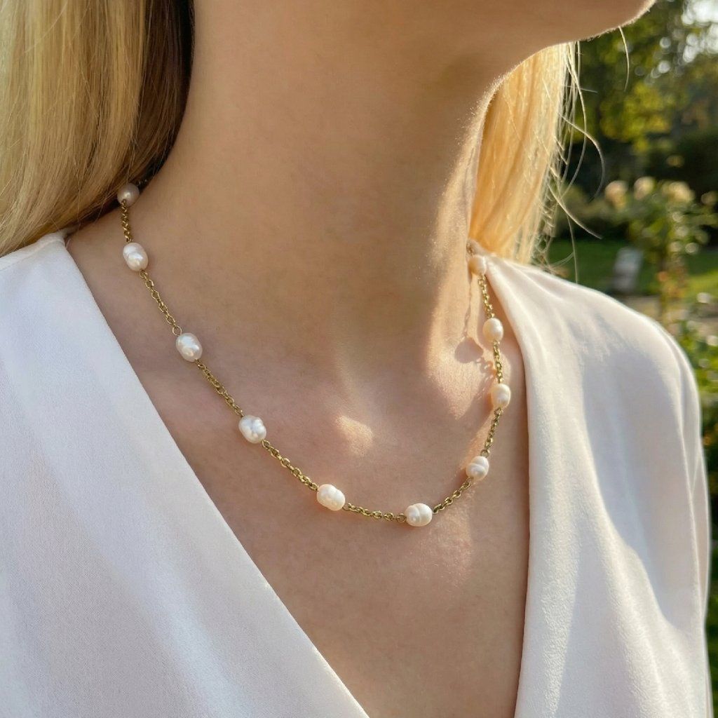 Náhrdelník s říčními perlami. Ručně vyrobený řetízek s pravými perlami Lisa je zdoben pravými sladkovodními perlami, které mu dodávají jedinečný půvab. Řetízek je vyroben z odolné chirurgické oceli, která je hypoalergenní, nečerná a perfektně drží svůj lesk. Lisa je náhrdelník, který se hodí pro všechny, jež chtějí nosit šperk s osobitým kouzlem. Jeho nadčasový design vynikne při každé příležitosti a stane se vaším oblíbeným doplňkem.