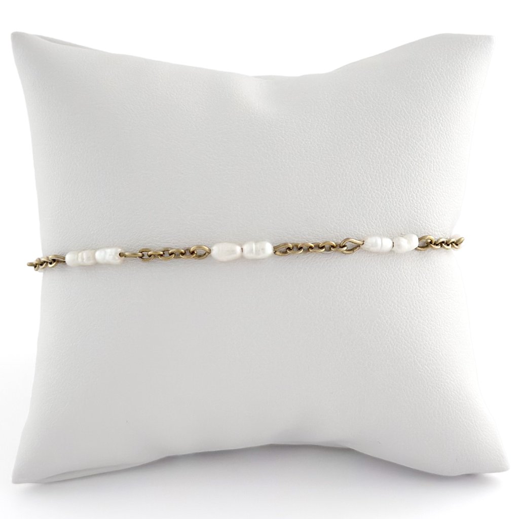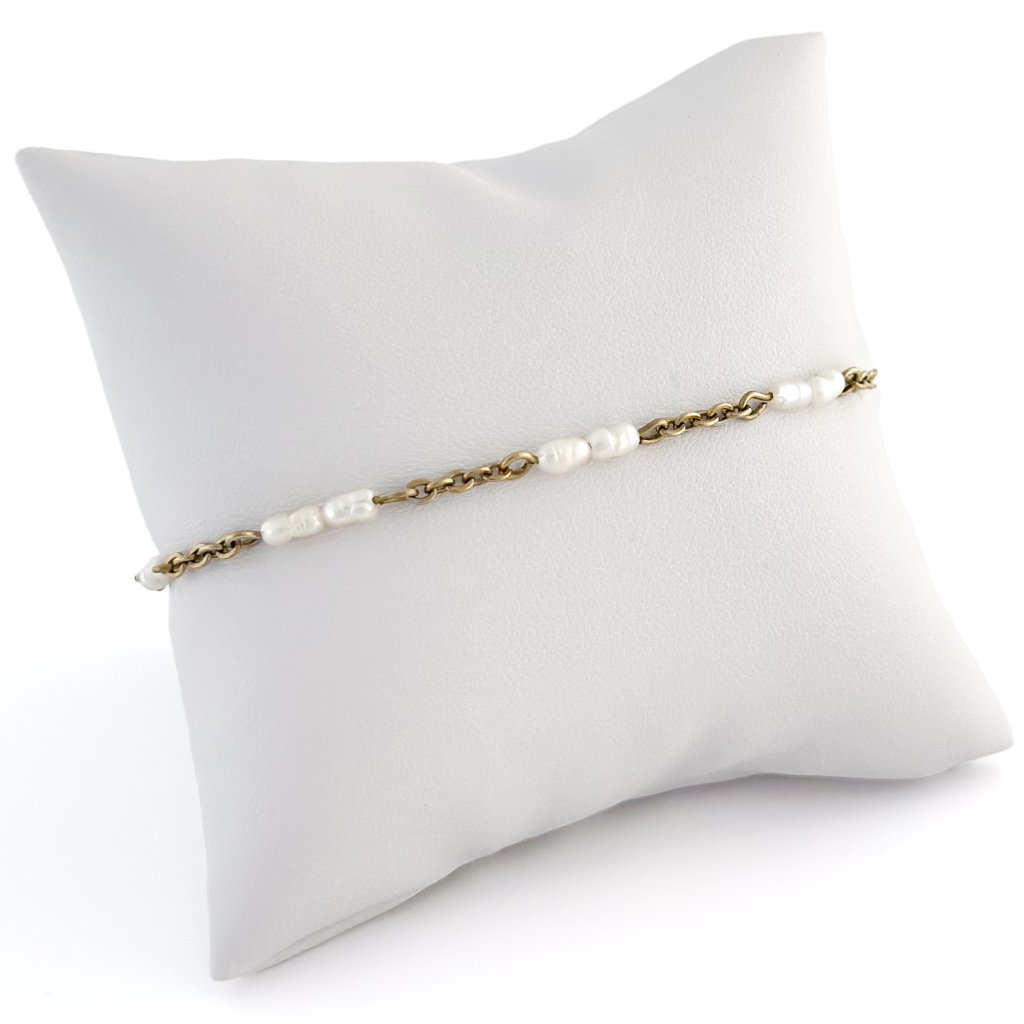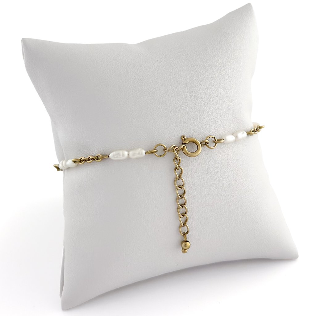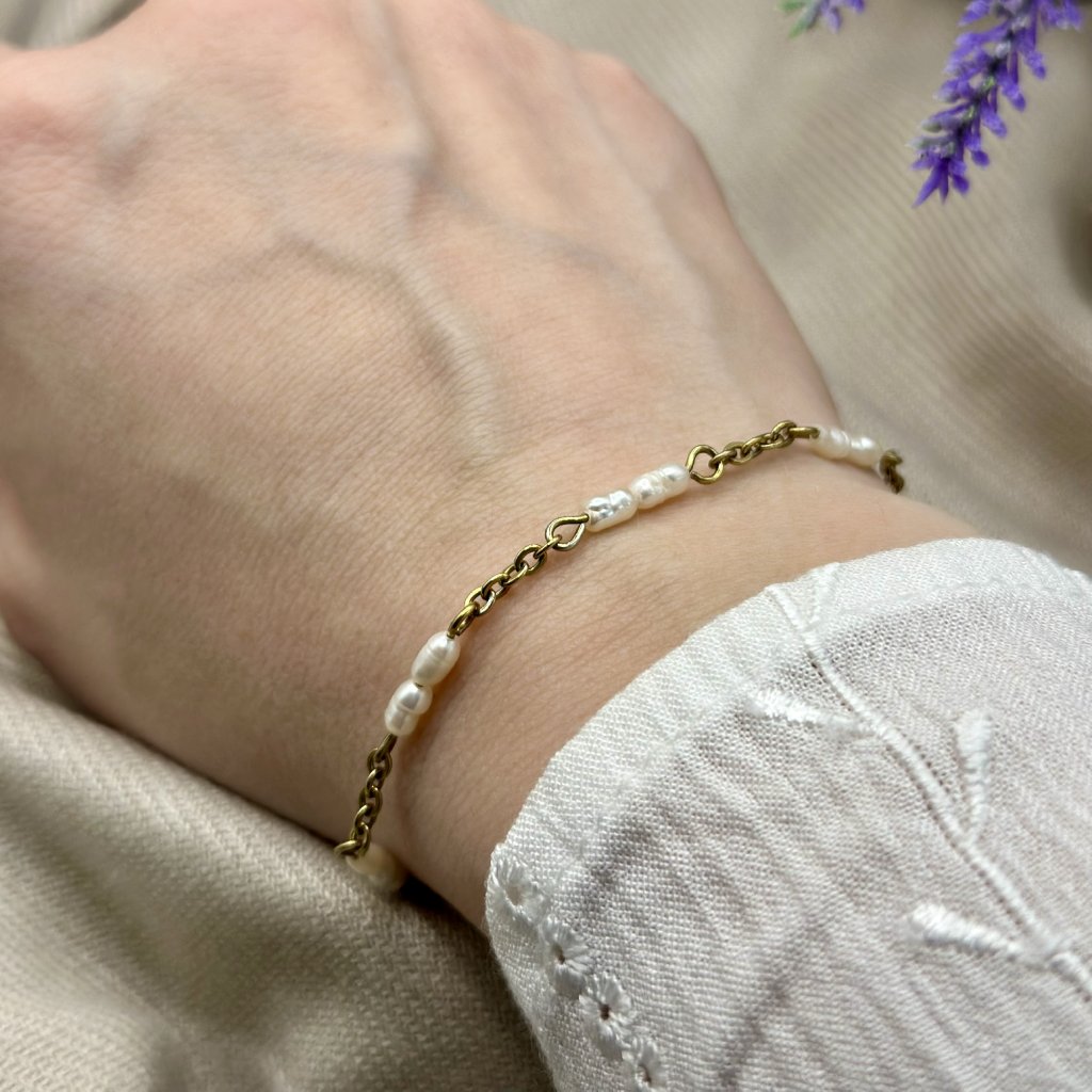 Náramek z pravých perel. Minimalistický náramek Noto zdobí říční perličky. Řetízek je vyroben z vysoce odolné chirurgické oceli, která je pokována metodou PVD v České Republice. To zajistí odolnost a stálost zlacení. Délku náramku Vám mohu upravit na míru.