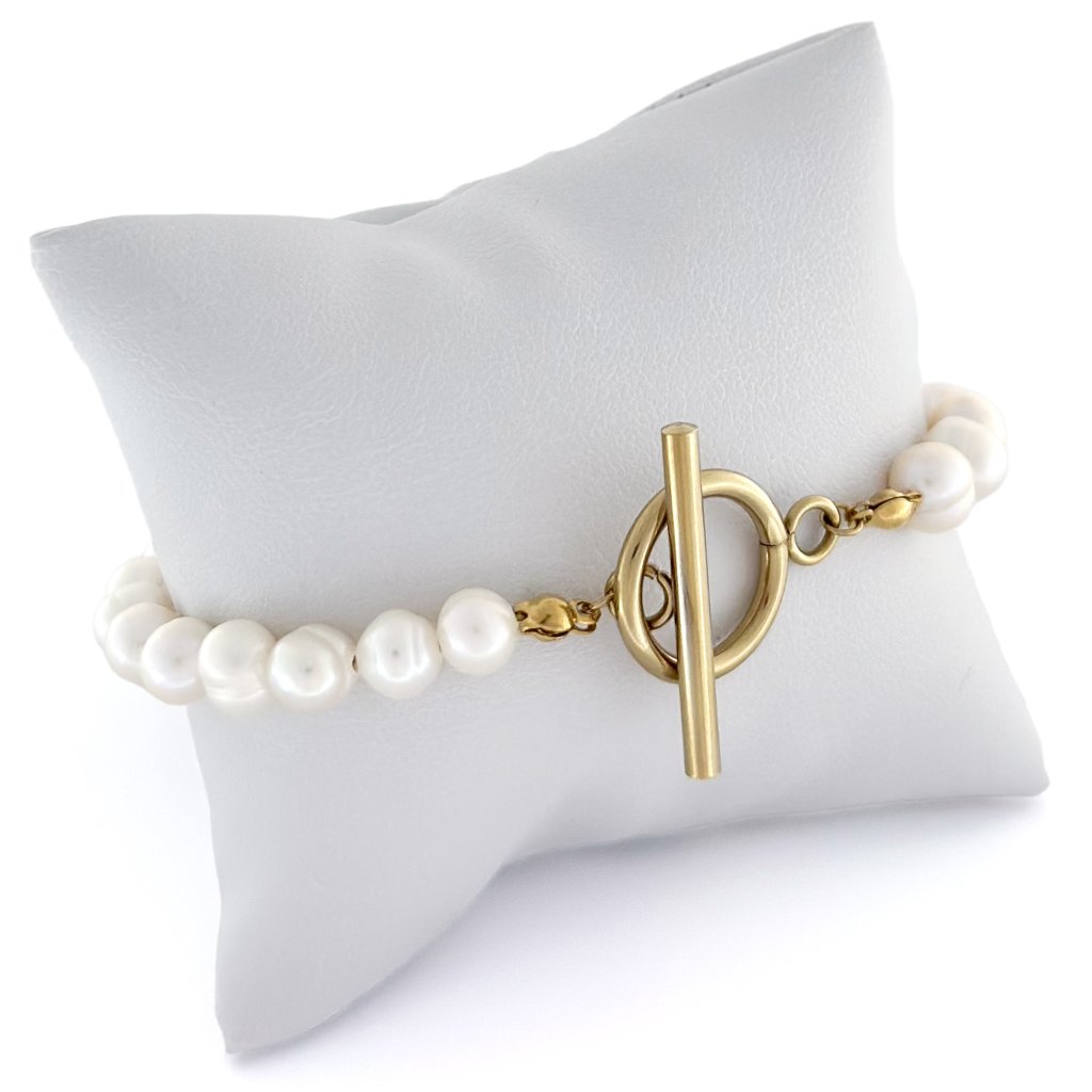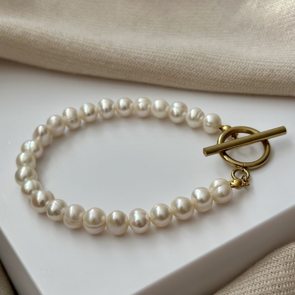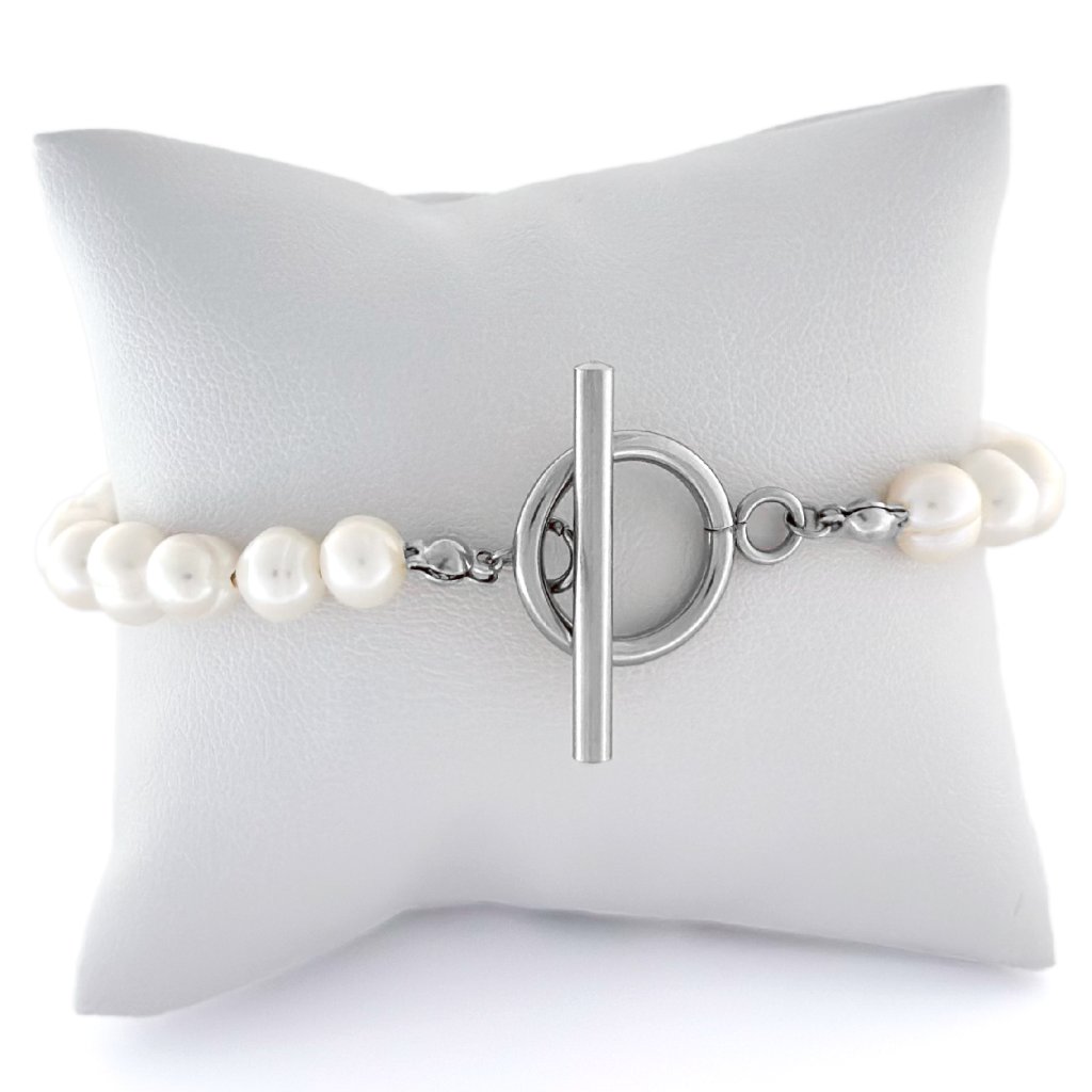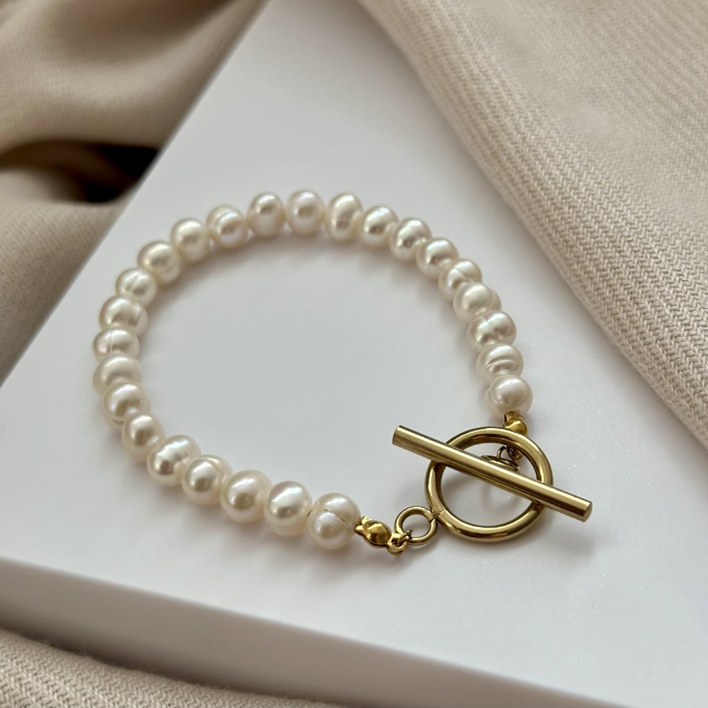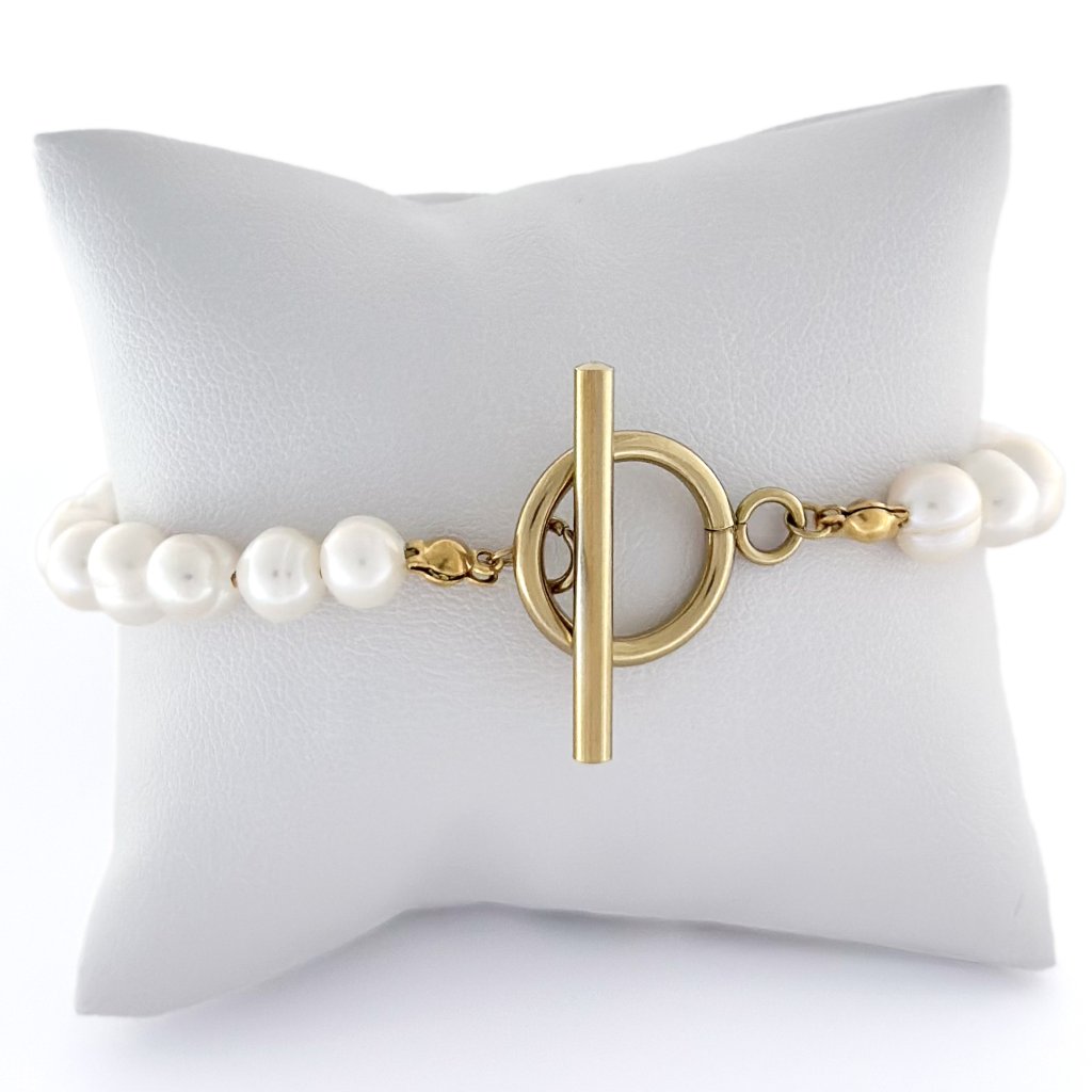 Náramek z říčních perel. Dominantou náramku je americké zapínání, které mu dodá nevšední vzhled. Komponenty jsou z odolné chirurgické oceli, která je hypoalergenní. Perlový náramek je k dispozici ve zlatém i stříbrném odstínu a upravím Vám délku přesně na míru.