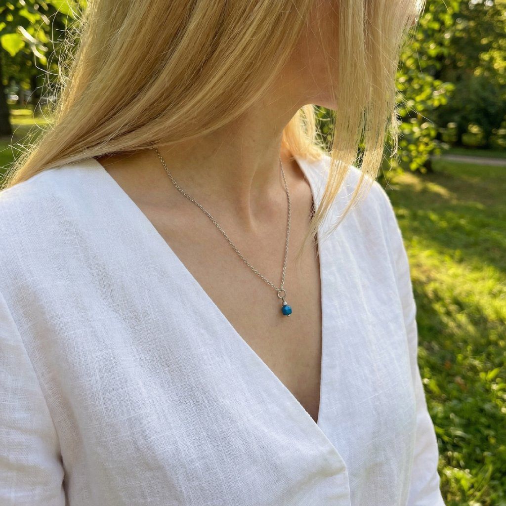 Minimalistický náhrdelník s přírodním apatitem přináší do vašeho šperkového arzenálu jedinečný dotek elegance. Jemný řetízek vyrobený z chirurgické oceli zaručuje odolnost a stálost, což z něj činí ideální doplněk pro každodenní nošení.