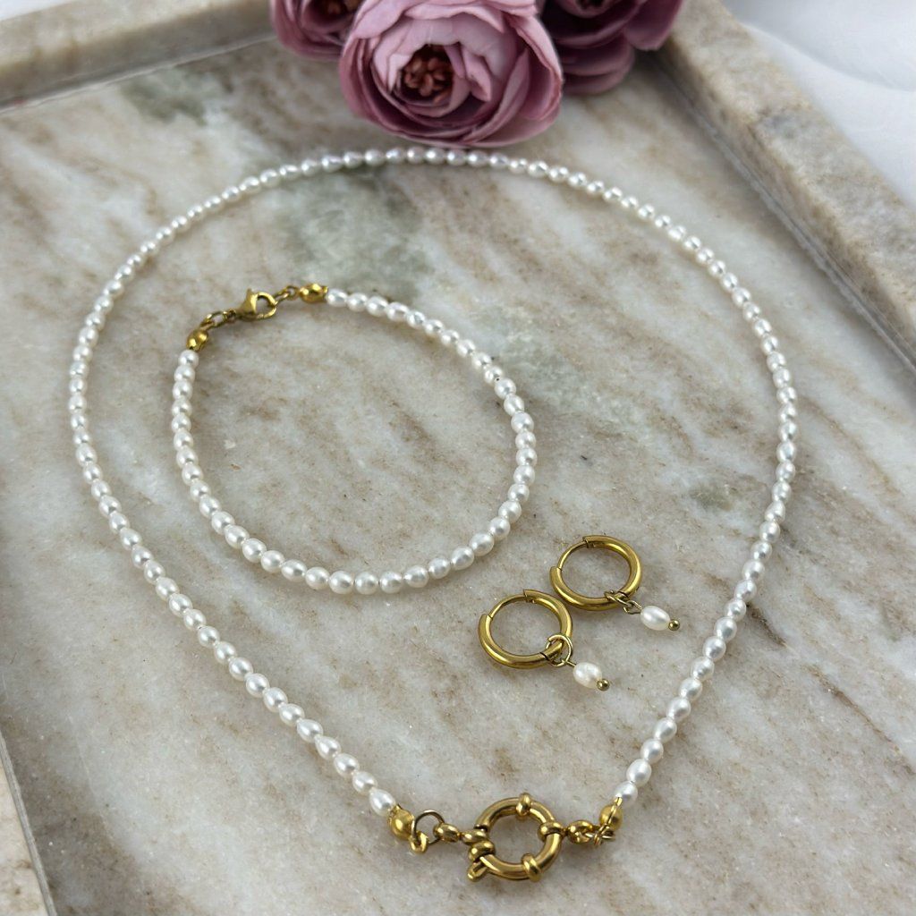 Souprava šperků s říčními perlami. Výhodný set Noemi obsahuje náušnice, náhrdelník a náramek. Náhrdelník a náramek jsou zdobeny pravými sladkovodními perlami vysoké kvality. Kroužkové náušnice zdobí jedna perla. Náušnice a ostatní komponenty jsou vyrobeny z chirurgické oceli, která je hypoalergenní a nečerná. Možné zakoupit i každý kousek zvlášť. K dispozici ve stříbrné i zlaté variantě. V případě zájmu Vám upravím délku náhrdelníku a náramku na míru.